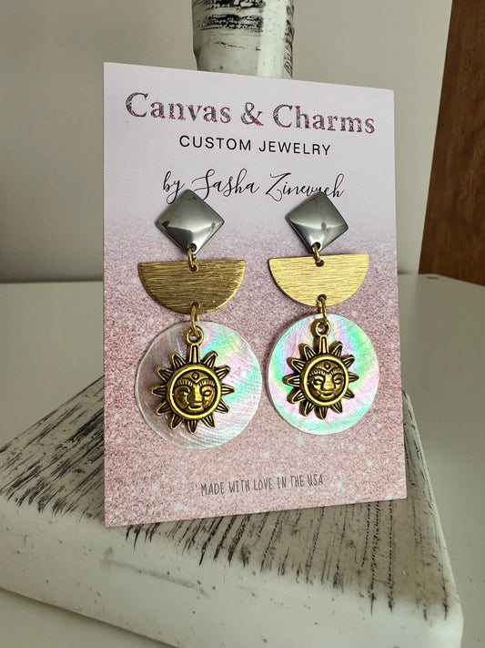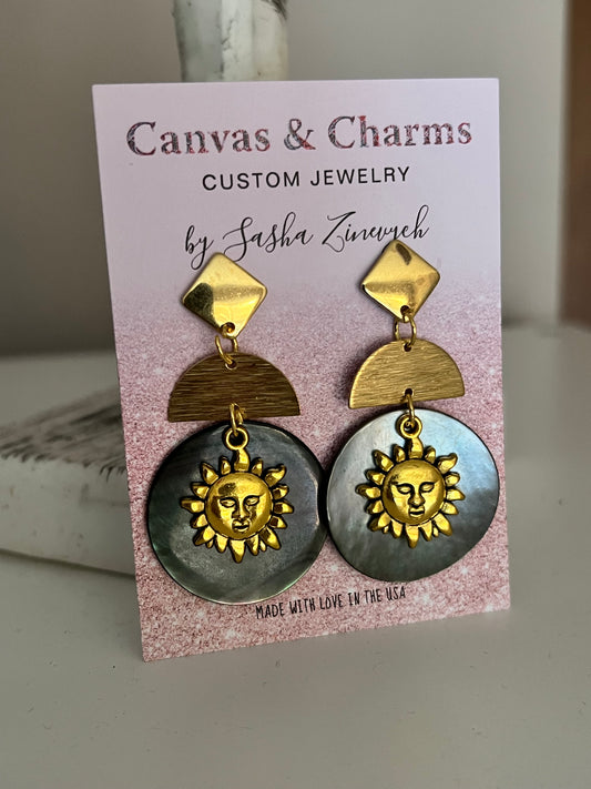 Celestial Statement Earrings with Sun and Black Pearl Discs