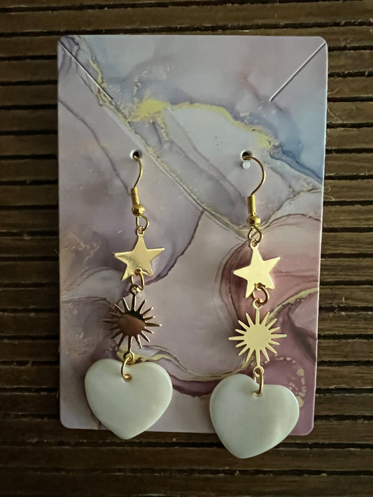 Celestial Handmade Gold Drop Earrings with Stars and Natural Shell Hearts
