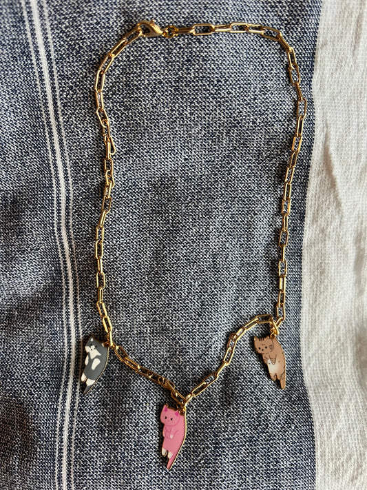 Cute Handmade Chunky Gold Paperclip Chain Necklace with Cat Charms