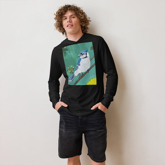 Hooded unisex long-sleeve tee with Blue Jay art print