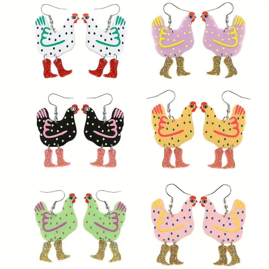 Polka Dot Chicken in Boots Dangle Drop Earrings