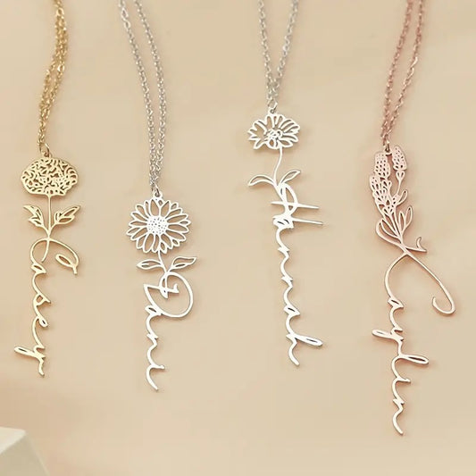 Women's Custom Name Necklace in Script with Birth Flower Design Gift for Her